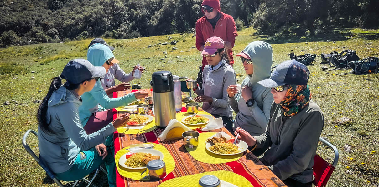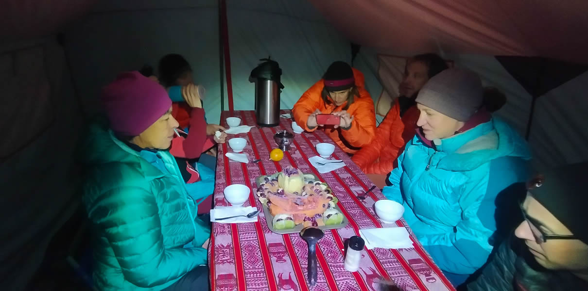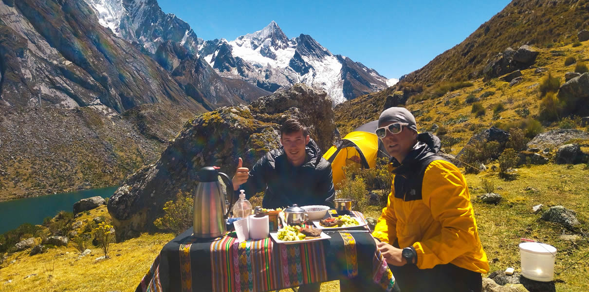 Food is essential to increase the chances of successful ascents during hiking and climbing expeditions. We have professional cooks who are in charge of making a nutritious meal to recover energy and we consider cases of special diets, such as vegetarian or coeliac diets, or if the meals must have some special way of preparation. During the expeditions, we provide fresh food such as bread, meat, eggs, fruits, and vegetables.